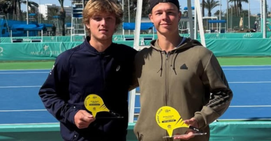 César Bouchelaghem (à droite sur la photo) a remporté dimanche son deuxième tournoi Futures au 15 000 $ de Monastir. Un succès en deux sets sur le Belge Jack Loge 7-5, 6-1. C'est déjà dans cette ville que le natif d'Annecy avait remporté son premier titre professionel au mois d'octobre. L'ancien de l'université de Washington DC, jouait seulement son deuxième tournoi de la saison.